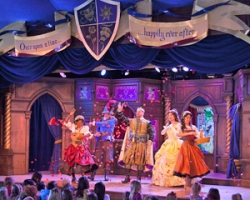 Also in Fantasyland is the all-new Fantasy Faire, where guests greet their favorite Princesses in the Royal Hall, or they may see Belle or Rapunzel taking part in fresh and whimsical versions of their own tales on the stage of the Royal Theatre. Located on the south end of the Fantasy Faire courtyard, the Royal Theatre is an open-air structure in the style of a tent at a medieval fair.