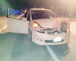 At about 1:00 AM traffic was waning so the checkpoint was closed. Seal Beach Police personnel began to break down the checkpoint. At about 1:15 AM a White Honda Fit that was travelling N/B on Seal Beach Blvd nearly struck an electronic sign that was on a trailer about 1/8 of a mile from the checkpoint itself. The driver swerved around the trailer, and back into the #3 lane. He then collided into a parked Seal Beach Police unit that had all of its emergency equipment activated.