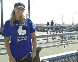 Pamela Winner is showing off her Seal Beach Founders Day T-shirt. The city will hold a celebration of its 95th birthday in October. In the meantime, T-shirt and sweat shirt sales at the Seal Beach Pier will help finance the celebrations later this year.
