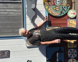 Three years later he has countless panels of “First People” art and several totems. Thunderbirds, tikis and Sun Gods adorn the inside and outside of his art-festooned home in the Seal Beach Trailer Park.