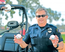 Seal Beach Police Sgt. John Scott delivered the Opening Day balls to Luke and Slater Travis (Photo by Marcella McSorley).