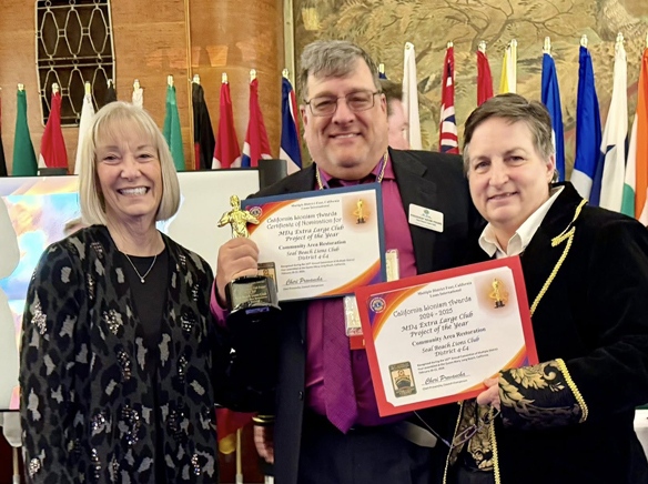 The Seal Beach Lions Club received an award for the Native Plant Restoration Project for River’s End Park. The Seal Beach club was honored at the Statewide Lions Convention on Saturday, Feb. 21, at the Queen Mary. Pictured from left to right are Lions International Director Liz Crooke, Seal Beach Lions President Kevin Young, California Lions Council Chair Cheri Provancha.