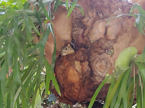 Then one day they noticed that Wasabi had bored into a large Staghorn Fern in the yard. The bulbous section of the fern is raised several feet off the ground. When they had a chance they peeked into the fern cavern and saw four newborn squirrels. Wasabi had made a nest for her young rodents.